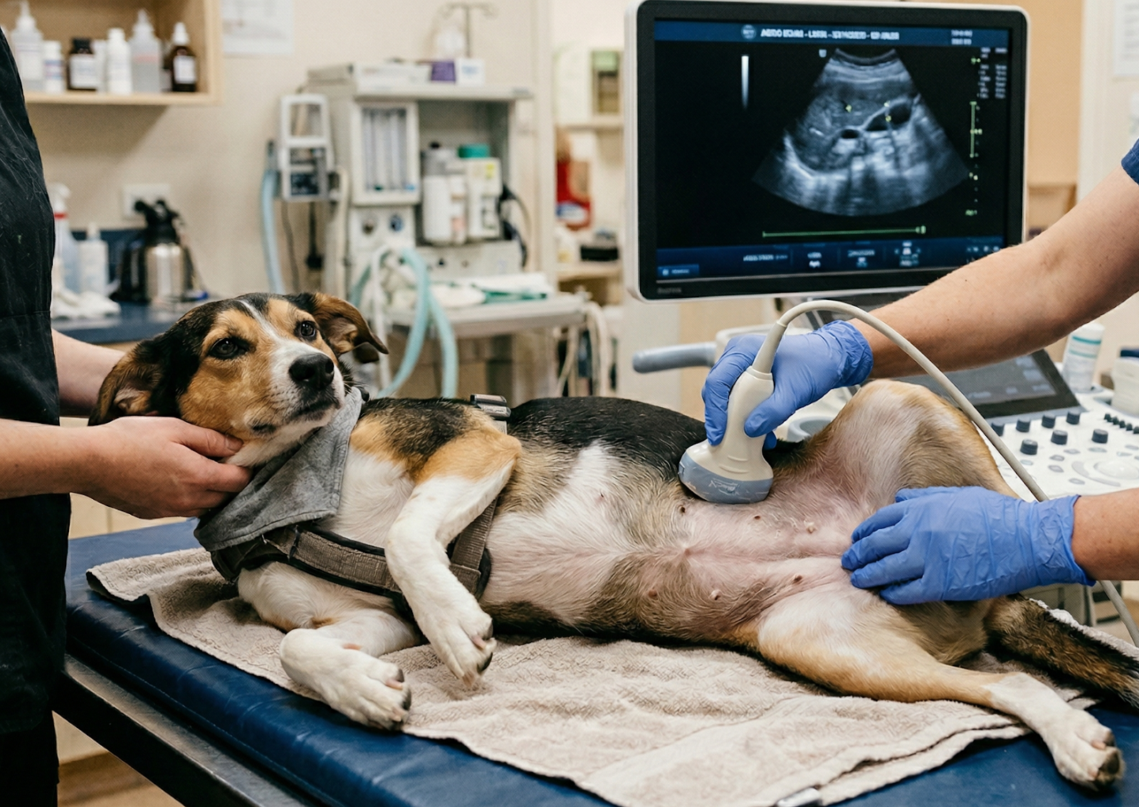 急変時には、まず腹部エコー検査を行い、腹腔内出血の有無や脾臓の状態を確認します。あわせてレントゲン検査で転移の有無を確認したり、血液検査で貧血の程度を評価したりします。